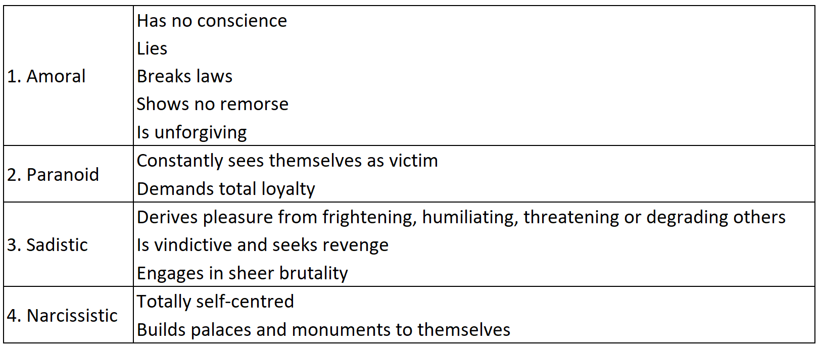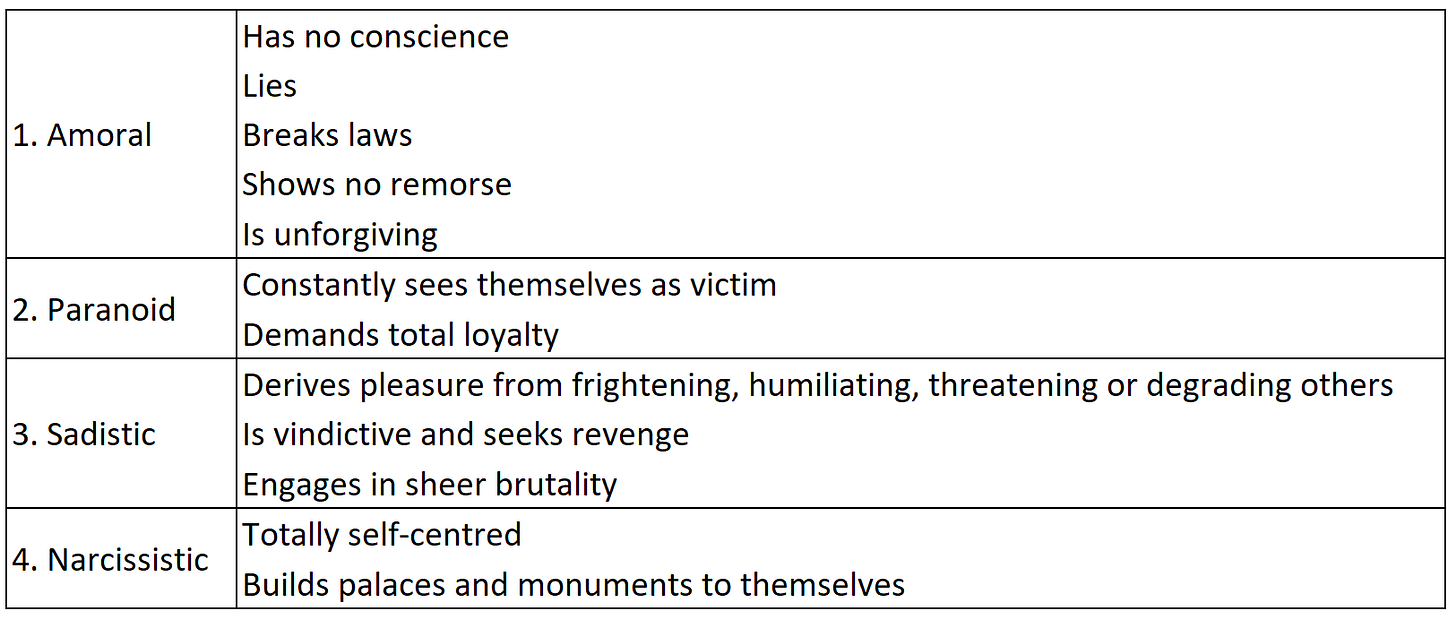 So what are some of the characteristics of dictators? John Gartner, a US psychologist, identifies them as malignant narcissists.